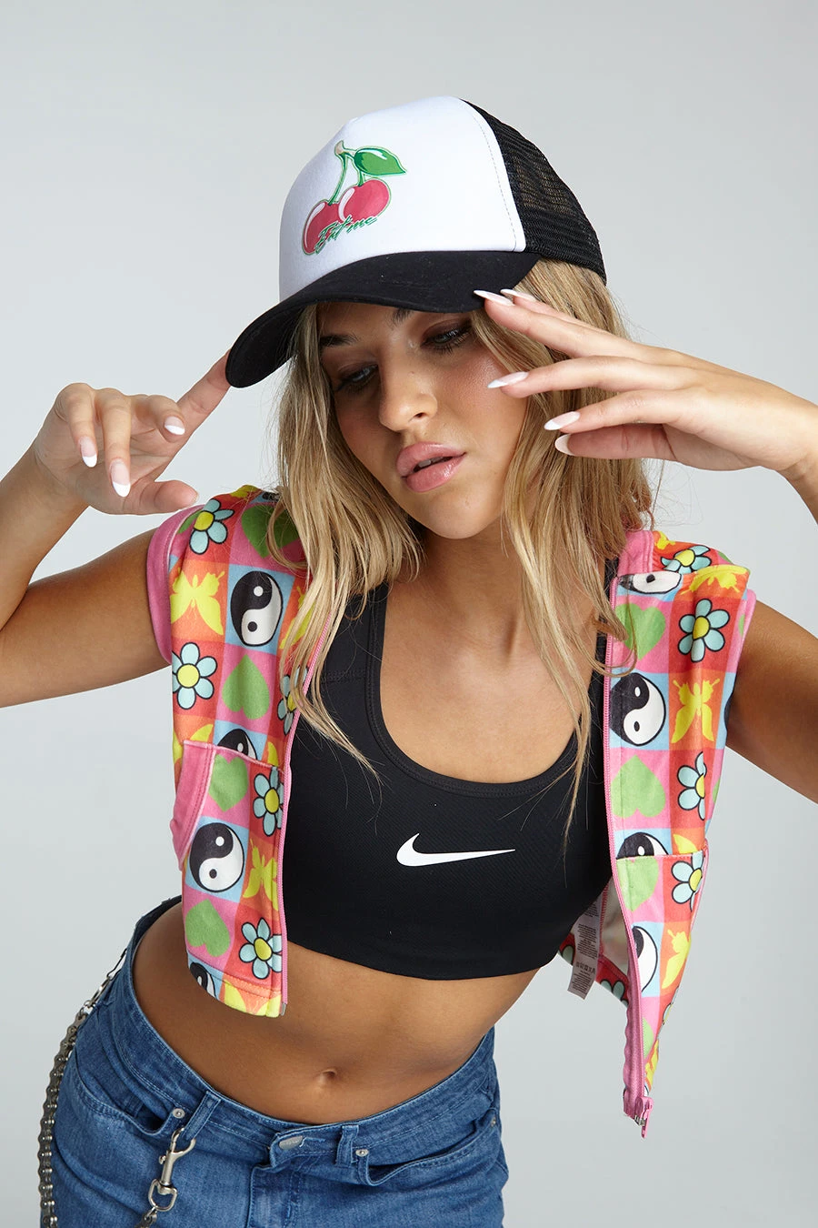 Women’s Foam Trucker Cap with Cherry Motif.