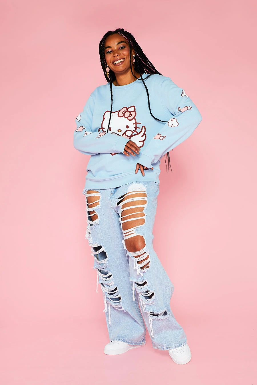 – Pastel blue sweater with white & pink, sleeve and front print detail